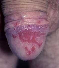 (3)、白色念珠菌性龟头炎的症状:在包皮龟头上可见红斑,表面光滑并有小疱疹,边缘较清楚,急性发作时有糜烂和渗液。
