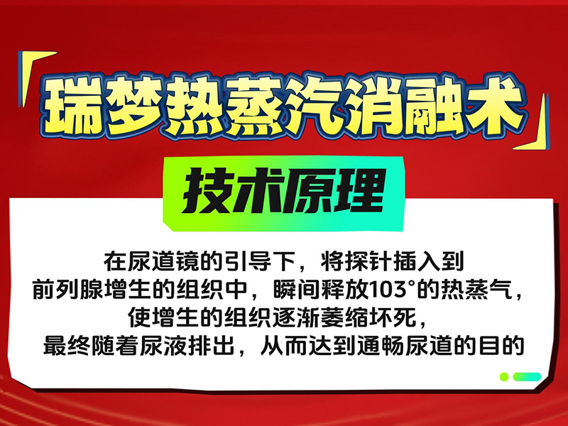 传统的前列腺电切、剜除手术虽然常见,但是安全隐患极大,可能发生出血、感染、尿道损伤、尿失禁等并发症,尤其可能会损害患者原有的性功能,出现无精症、少精症或射精时无法排出精液的情况,这也是导致前列腺患者迟迟不愿接受手术治疗的根本原因。随着美国“Rezūm瑞梦”热蒸汽消融技术的问世,利用103℃无菌水蒸汽的弥散式热能释放,使前列腺增生的组织细胞瞬间坏死,并被人体自然吸收,从而缩小前列腺体积,不仅解决了传统手术带来的诟病,同时能够完美的保护好患者的性功能,极大地造福了广大中老年男性患者。