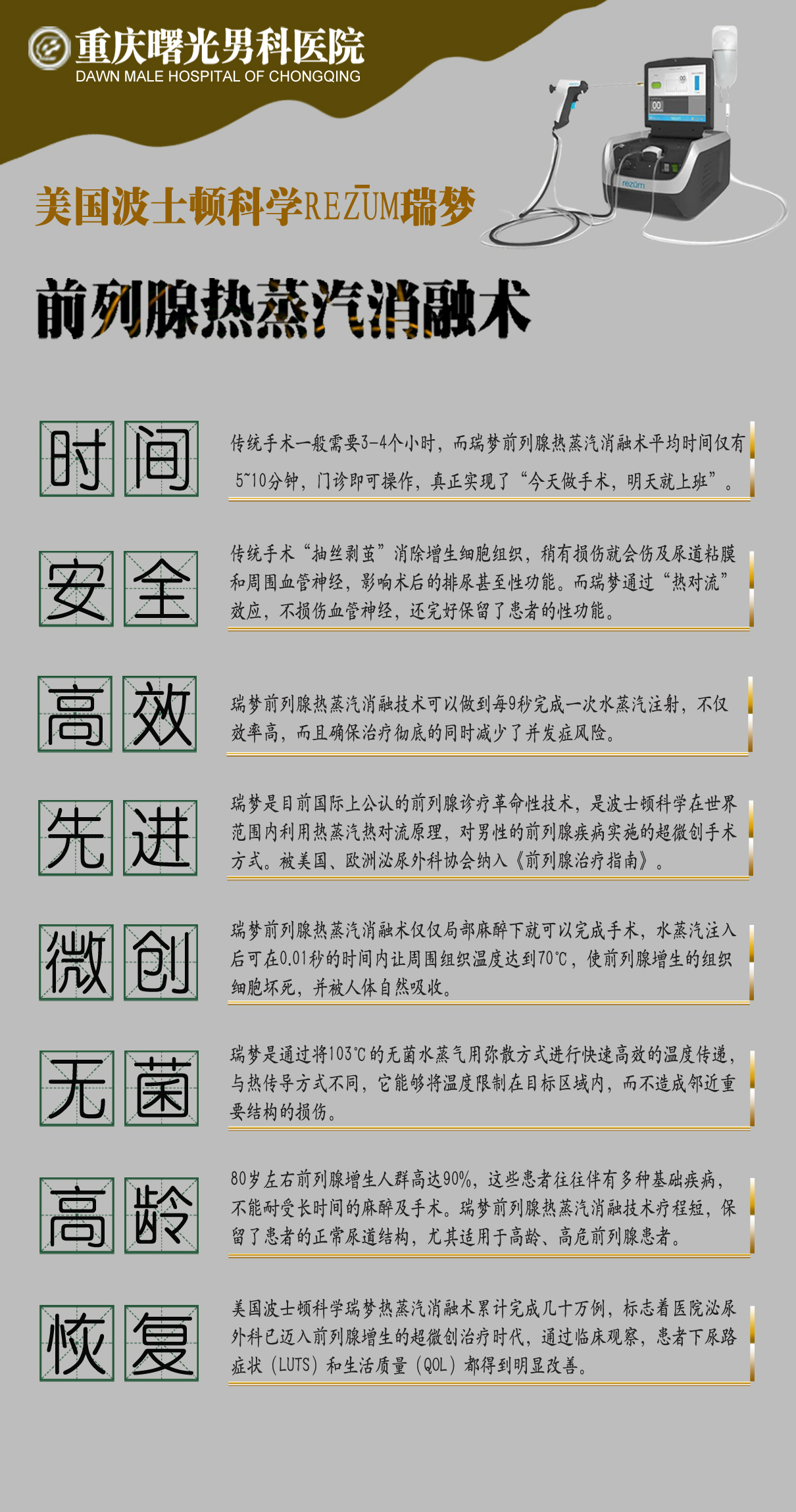 一直以来,前列腺疾病困扰着很多广大男性患者,传统的前列腺增生主要是通过电切、等离子、激光剜除等技术方式,需要全身麻醉。而很多高龄患者伴有多种基础疾病,不能耐受,因此很多人只能靠保守治疗,长期忍受着病痛折磨。重庆曙光男科医院成功引进的美国波士顿科学瑞梦前列腺热蒸汽消融术(Rezūm,又称“瑞梦”)是通过人体尿道伸入进行,患者几乎感受不到疼痛,单次时间仅5-10分钟左右,不用住院。由于是超微创技术,不仅时间短,创伤也很小,还可有效减少术后出血和感染,同时破解传统方式可能损伤尿道黏膜的弊端。该技术目前在美国西奈山医院、梅奥医学中心等以及国内几个先进的大医院开展,现首次由重庆曙光男科医院重磅引进落户于重庆,全力解决了重庆男性前列腺患者的病痛折磨。
