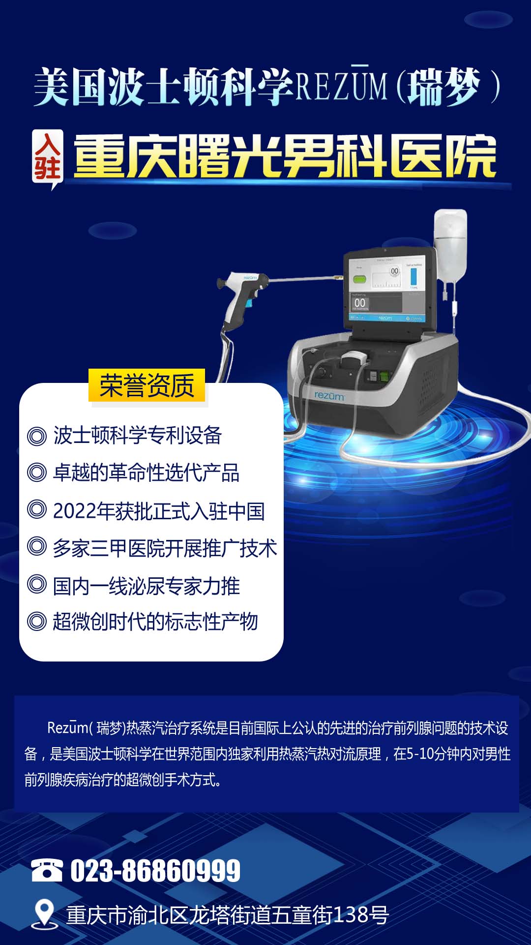对比药物及其它微创手术,Rezūm瑞梦热蒸汽消融治疗手术时间短、创伤小、治疗效果好、疗效稳定、恢复时间快、安全性高、围手术期不良反应轻微,对包括勃起和射精在内的性功能没有负面影响,特别是对于那些不适合手术或不想继续终身药物治疗的人,术后可显著改善下尿路症状、减轻广大中老年患者的疾病负担,助力实现“健康老龄化”。