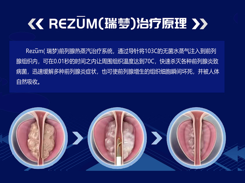 传统的前列腺电切、剜除手术虽然常见,但是安全隐患极大,可能发生出血、感染、尿道损伤、尿失禁等并发症,尤其可能会损害患者原有的性功能,出现无精症、少精症或射精时无法排出精液的情况,这也是导致前列腺患者迟迟不愿接受手术治疗的根本原因。随着美国“Rezūm瑞梦”热蒸汽消融技术的问世,利用103℃无菌水蒸汽的弥散式热能释放,使前列腺增生的组织细胞瞬间坏死,并被人体自然吸收,从而缩小前列腺体积,不仅解决了传统手术带来的诟病,同时能够完美的保护好患者的性功能,极大地造福了广大中老年男性患者。